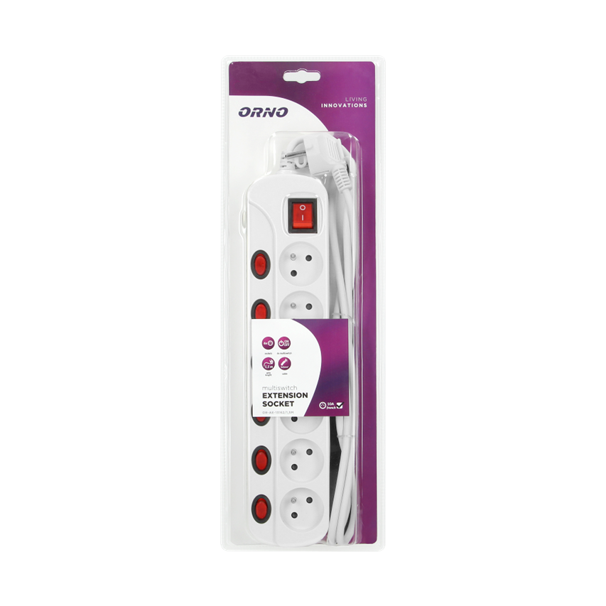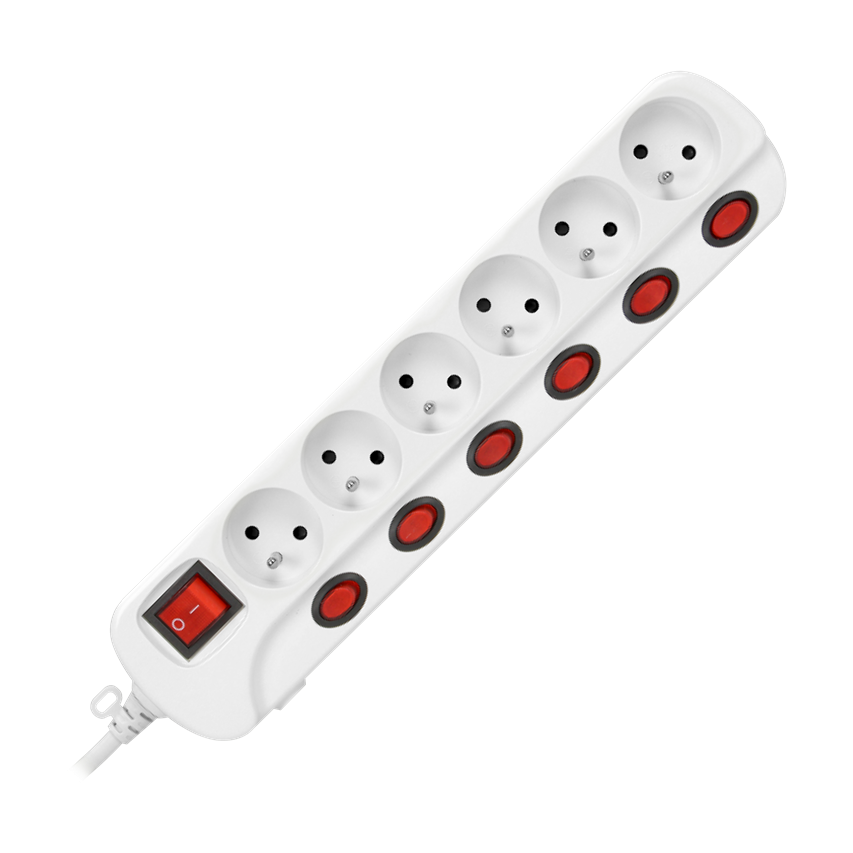 - Multiprise "Multiswitch", 6 prises 2P+Z, câble 3x1.0mm2, longueur 1.5m, avec interrupteurs lumineux : principal à deux voies et interrupteurs séparés pour chaque prise. Interrupteur thermique. 10A/230VAC