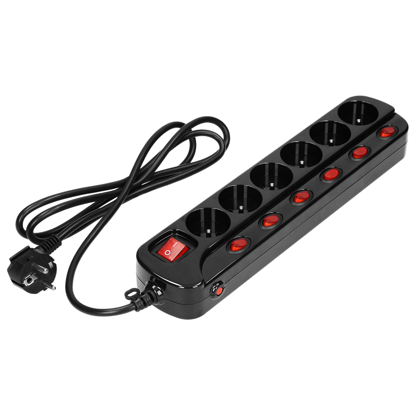- Multiprise "Multiswitch", 6 prises 2P+Z, câble 3x1.0mm2, longueur 1.5m, avec interrupteurs lumineux : principal à deux voies et interrupteurs séparés pour chaque prise. Interrupteur thermique. 10A/230VAC, noir