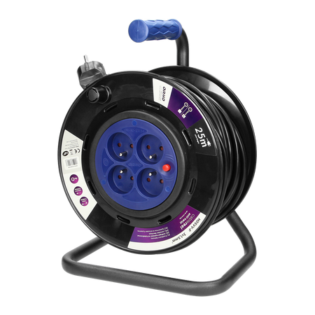 - Enrouleur de câble d'extension, 4 prises 2P+Z, câble PVC H05VV-F 3x1.5mm2, longueur 25m, prises FIXES, thermiques, couvertures de la piste de courant.