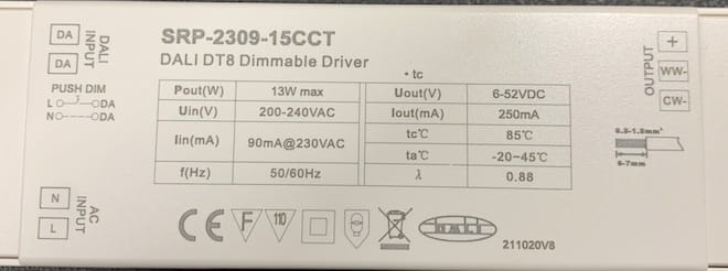 Le SRP-2309-15CCT est un pilote de LED DT8 CCT de 15W, 250mA, certifié DALI-2