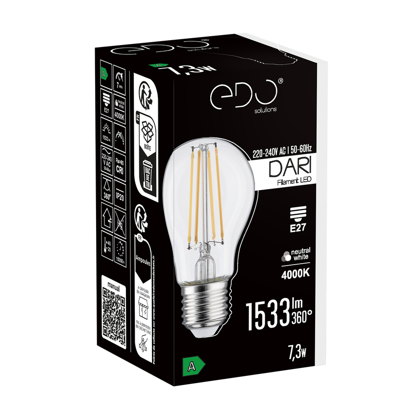Ampoule décorative DARI LED Filament 7,3W, E27, 4000K, 1533lm, 230V, CLEAR A60, EDO777712 EDO Solutions