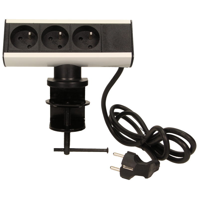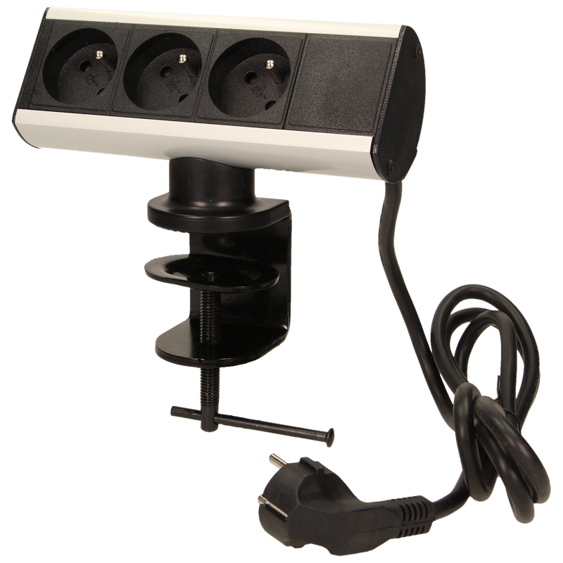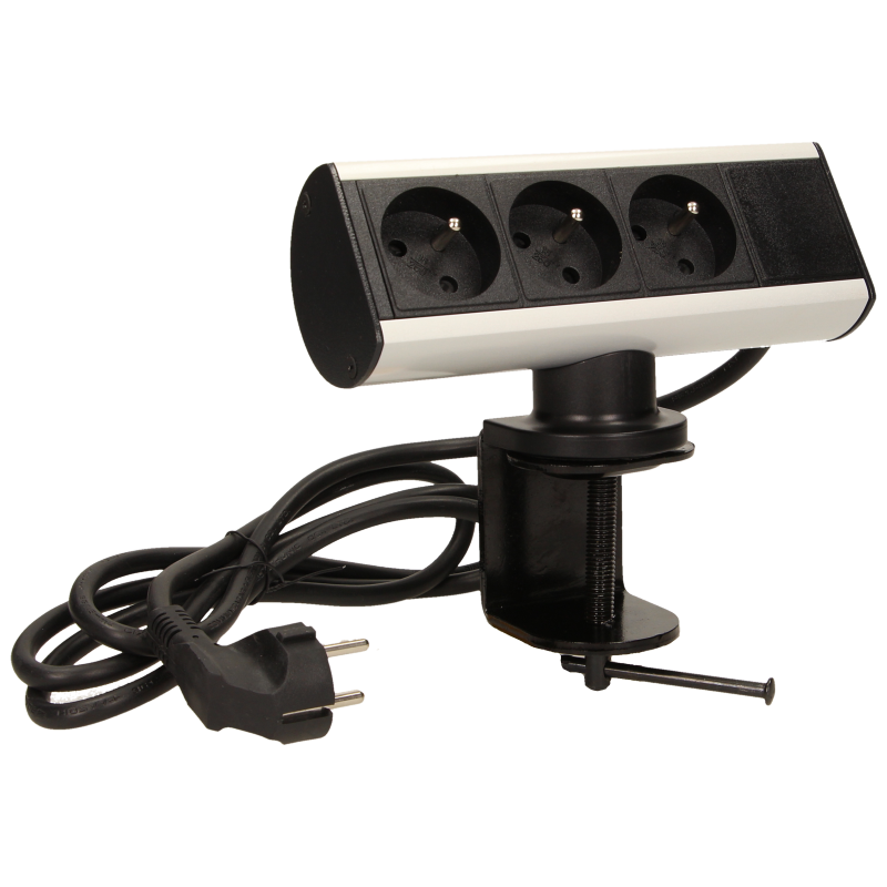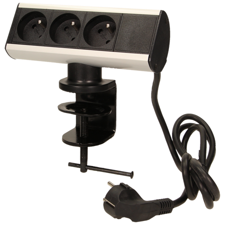 Prise de bureau équipée d'une borne à vis, qui permet de fixer le socle de la prise sur le bord d'un bureau ou d'une étagère sans avoir à percer de trous de fixation. L'appareil est équipé de trois prises de courant avec mise à la terre et d'un câble de 1,8 mètre. Construction métallique robuste.