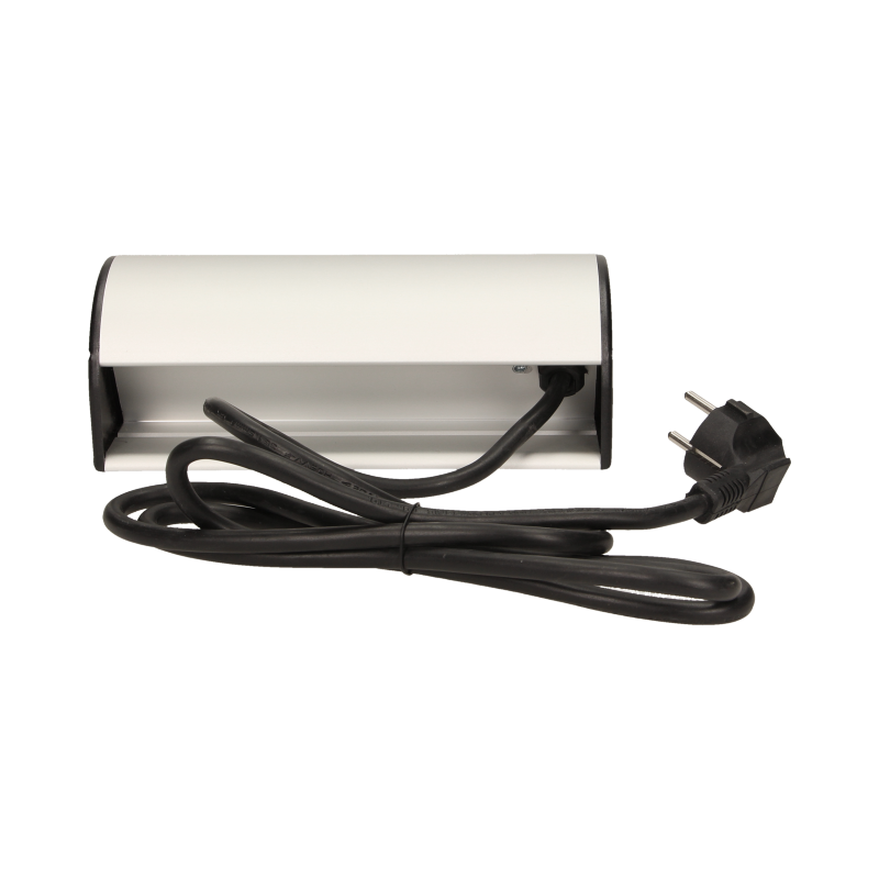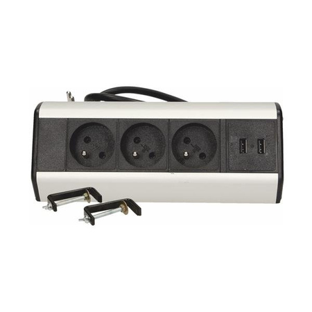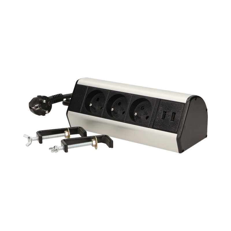 Prise de bureau équipée d'une borne à vis, qui permet de fixer le socle de la prise sur le bord d'un bureau ou d'une étagère sans avoir à percer de trous de fixation. L'appareil est équipé de trois prises de courant avec mise à la terre, 2 ports de charge USB et d'un câble de 1,8 mètre. Construction métallique robuste.