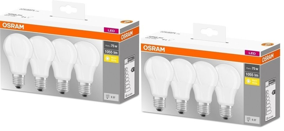 - Set d'ampoules LED Osram avec culot E27 et 10W, équivalent à 75W, forme traditionnelle, température de couleur 2700K, flux lumineux 1055lm. Le lot se compose de deux paquets de 4.